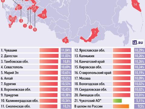 Тем не менее, в 20 регионах инфляция была двузначной. В основном, это регионы из европейской части страны. Однако в двадцатку попали и два региона из Дальневосточного федерального округа и один из Сибирского федерального округа. Это Республика Алтай, Камчатский край и Республика Бурятия.