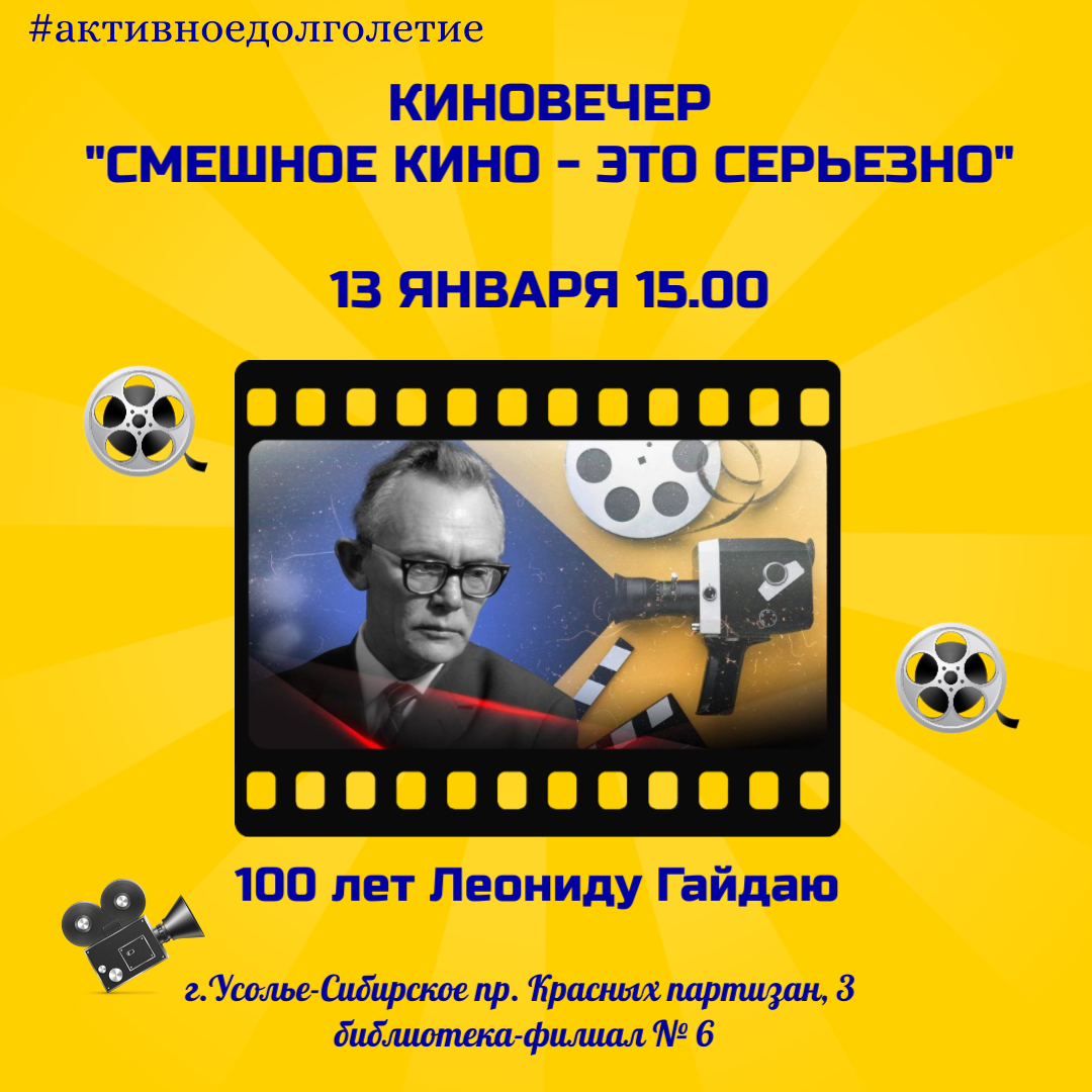 Желающих приглашаем 13 января в 15.00 познакомиться жизнью с творчеством режиссера Леонида Гайдая, пересмотреть отрывки из любимых фильмов на киновечере