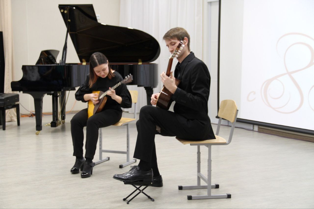 Ребята пели в хоре, дуэтом и сольно, играли на самых разных музыкальных инструментах, танцевали, и все без исключения через свои выступления дарили гостям свое душевное тепло и любовь. Подготовили подарки женщинам не только ученики, но и преподаватели Детской школы искусств. Прекрасное произведение на балалайке и гитаре исполнили Мария Гримберг и Евгений Ивакин.