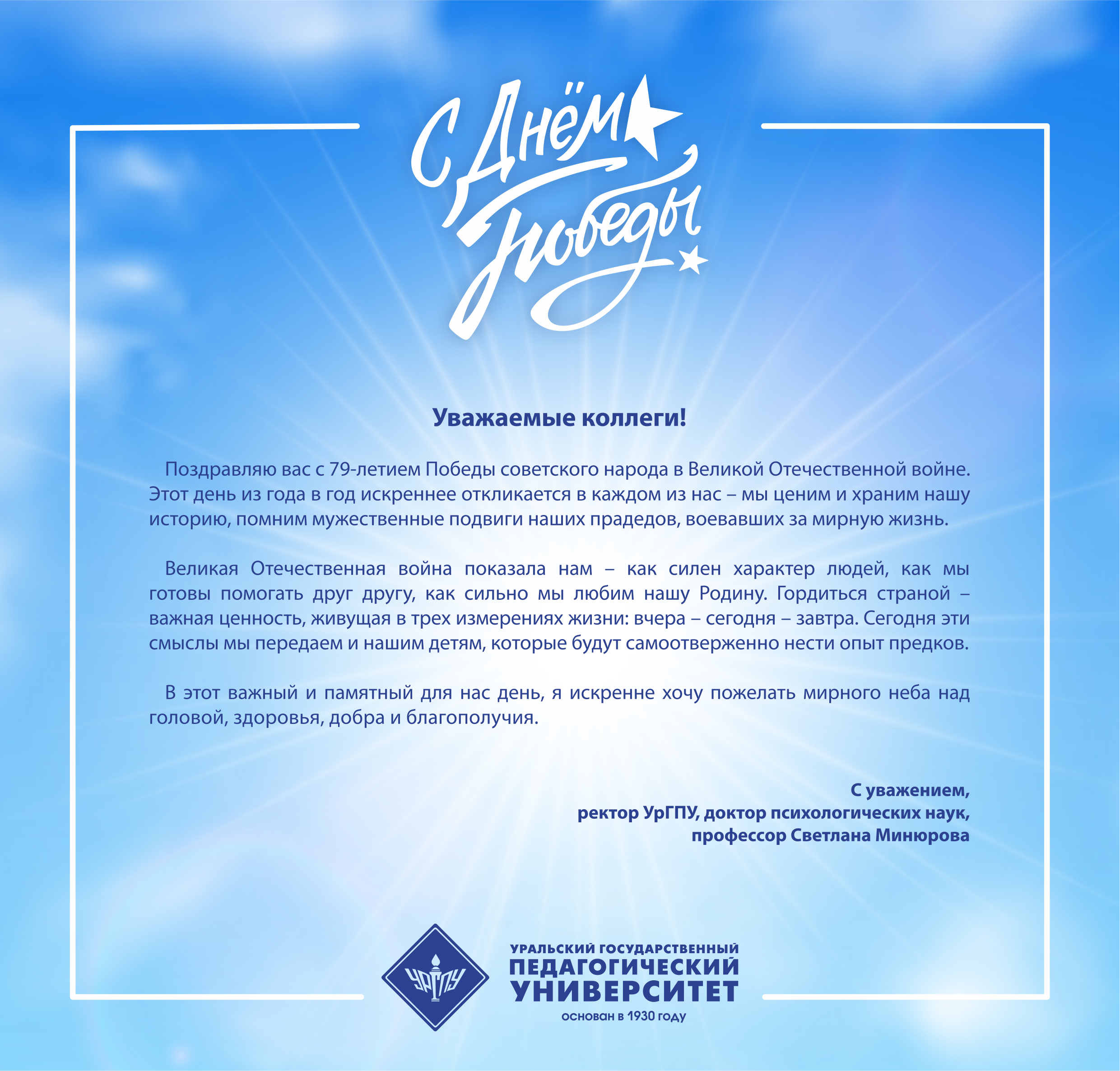 Уральский государственный педагогический университет поздравляет сотрудников Педагогического института ИГУ с Днем Победы.