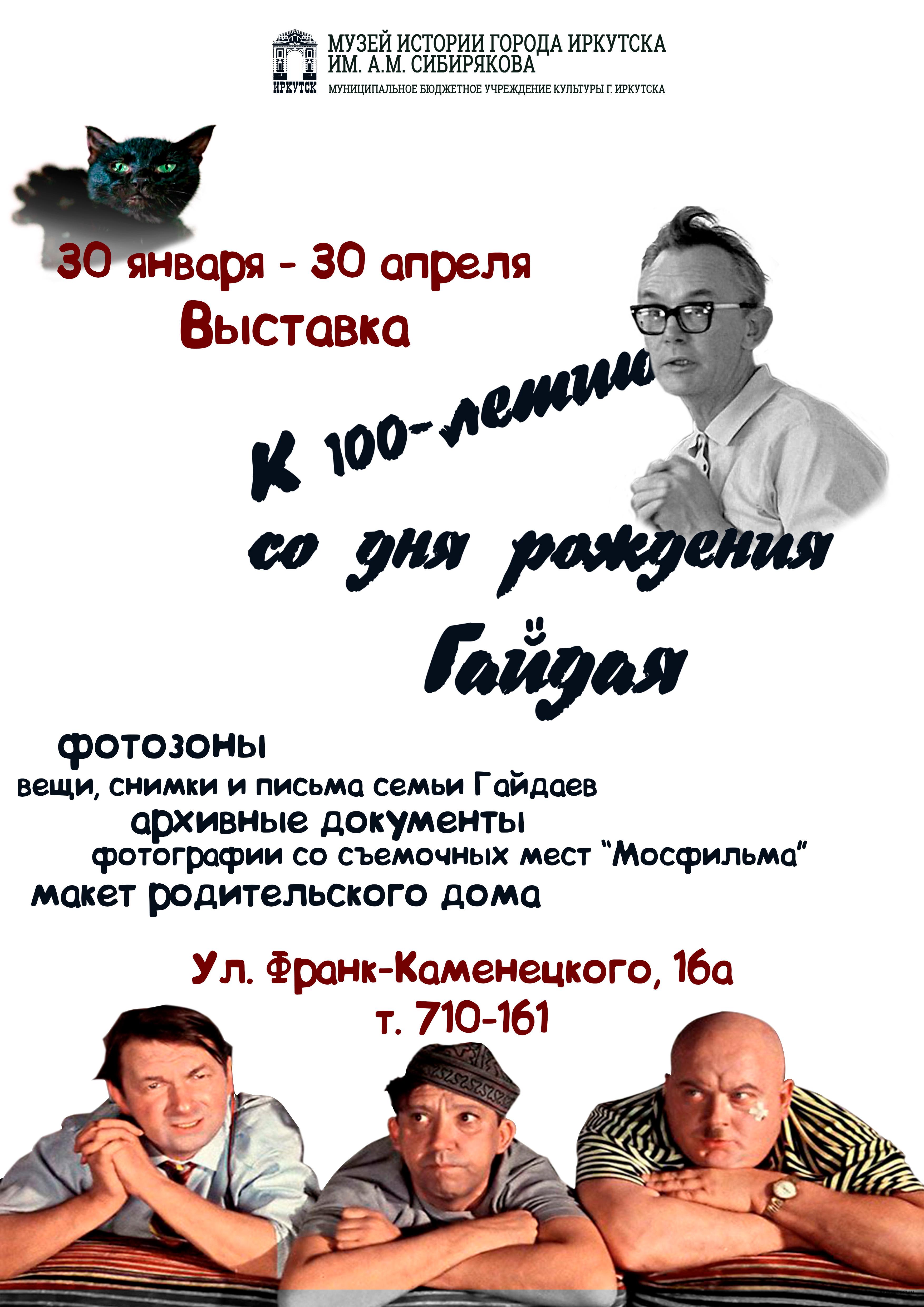 30 января, в день рождения Леонида Гайдая в музее истории им. А.М. Сибирякова состоится открытие выставки посвящённой 100-летнему юбилею выдающегося режиссера. Кроме традиционной экспозиции, где посредством документов, предметов и архивных снимков будет рассказано о семье нашего земляка, его творческой биографии, участии в Великой Отечественной войне, посетители смогут увидеть галерею, открывающую «Гайдаевские места в Иркутске», фотографии с мест съёмок любимых фильмов, которые музею любезно предоставили для выставки сотрудники киноконцерна «Мосфильм».