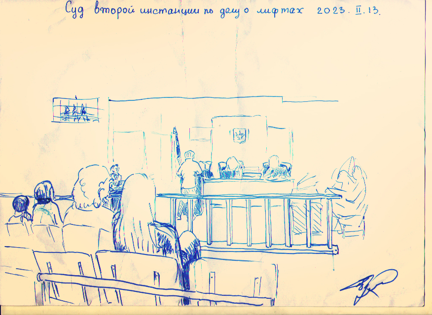 Суд не разрешил представителям СМИ проводить фото- и видеосъёмку заседания. Один из слушателей сделал его зарисовку