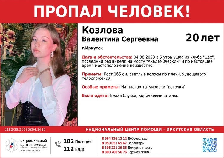 4 августа в Иркутске пропала 20-летняя Валентина Козлова. Девушка вышла из ночного клуба и исчезла, сообщает «КП-Иркутск».