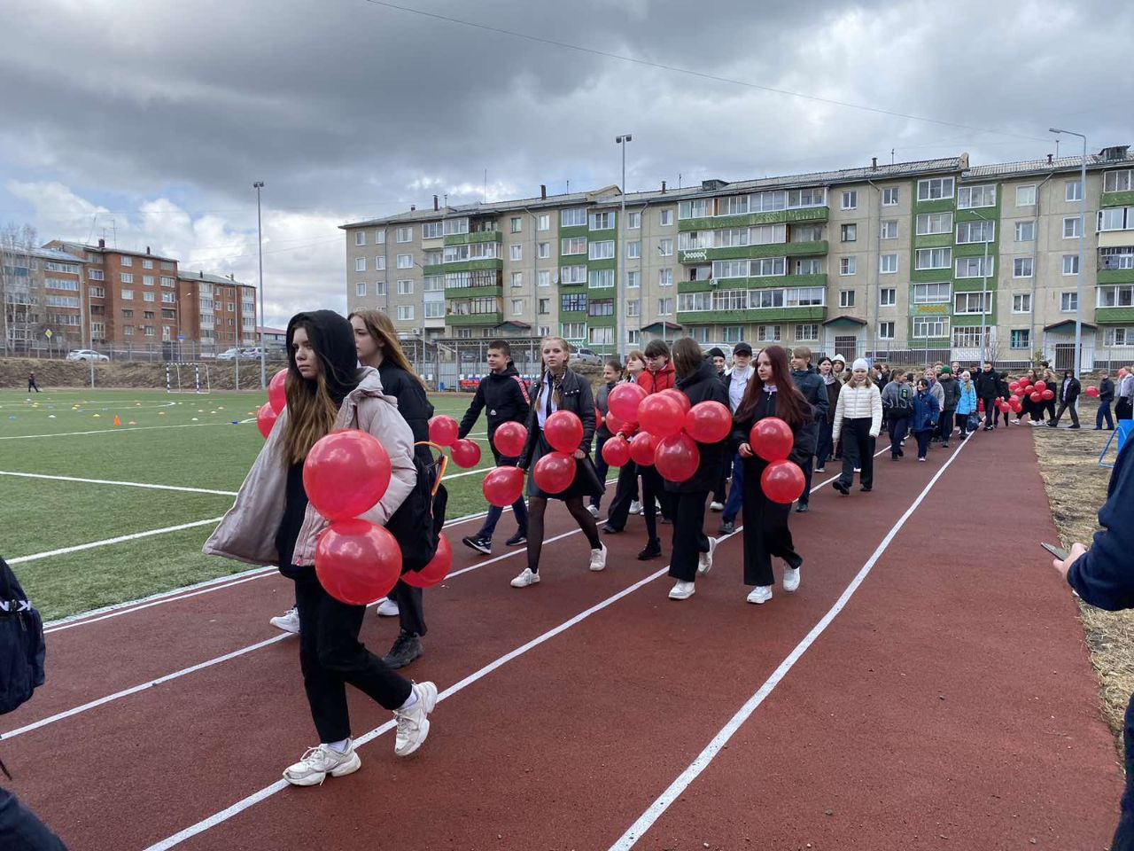 В назначенный день с ярко-красными шарами в руках большая процессия выдвинулась на школьный стадион. Там ребята вместе со своими учителями выстроились в символическую дату – «9 Мая». Все проходило быстро и слаженно, всем действом руководил директор школы Виктор Семечев.