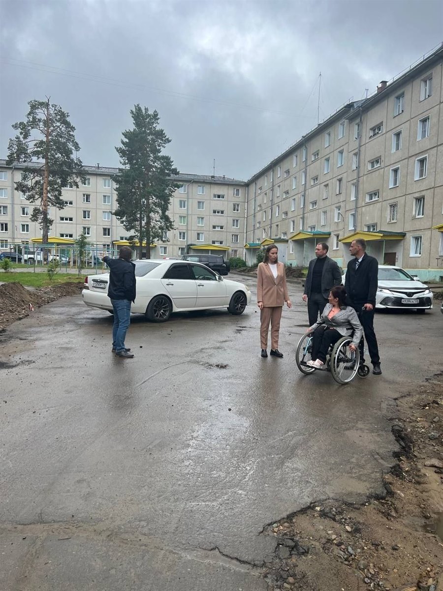 Заместитель мэра по вопросам жизнеобеспечения города Мария Данилова, Председатель Саянской городской Думы Евгений Каплин, депутат и член Саянского общества инвалидов-колясочников «Шанс» Ирина Дружинина, директор управляющей компании «Труд» Денис Терехов, совместно с подрядчиком