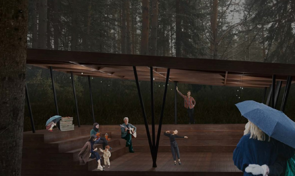Амфитеатр имеет монолитный фундамент из тяжелого бетона, деревянные конструкции планируется использовать из стабилизированной древесины хвойных пород, кровлю – из стального профлиста, покрытия пола и стен – из террасной доски. Готовое сооружение будет камерным местом для встреч, проведения мероприятий.