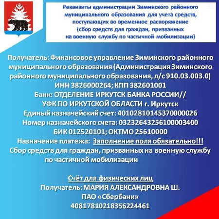 Уважаемые земляки! Администрация Зиминского района открыла счёт для оказания помощи мобилизованным гражданам.