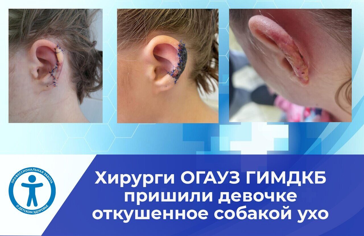 Травму 11-летней девочке нанесла ее собака. С момента происшествия до обращения в ОГАУЗ ГИМДКБ прошло около двух часов, и дежурный врач оториноларинголог Евгения Александровна Давыдова по экстренным показаниям провела оперативное лечение - пришила ампутированный кусок ушной раковины, хотя транспортирован он был неправильно, безо льда. Врачи наложили 29 швов и госпитализировали пациента.