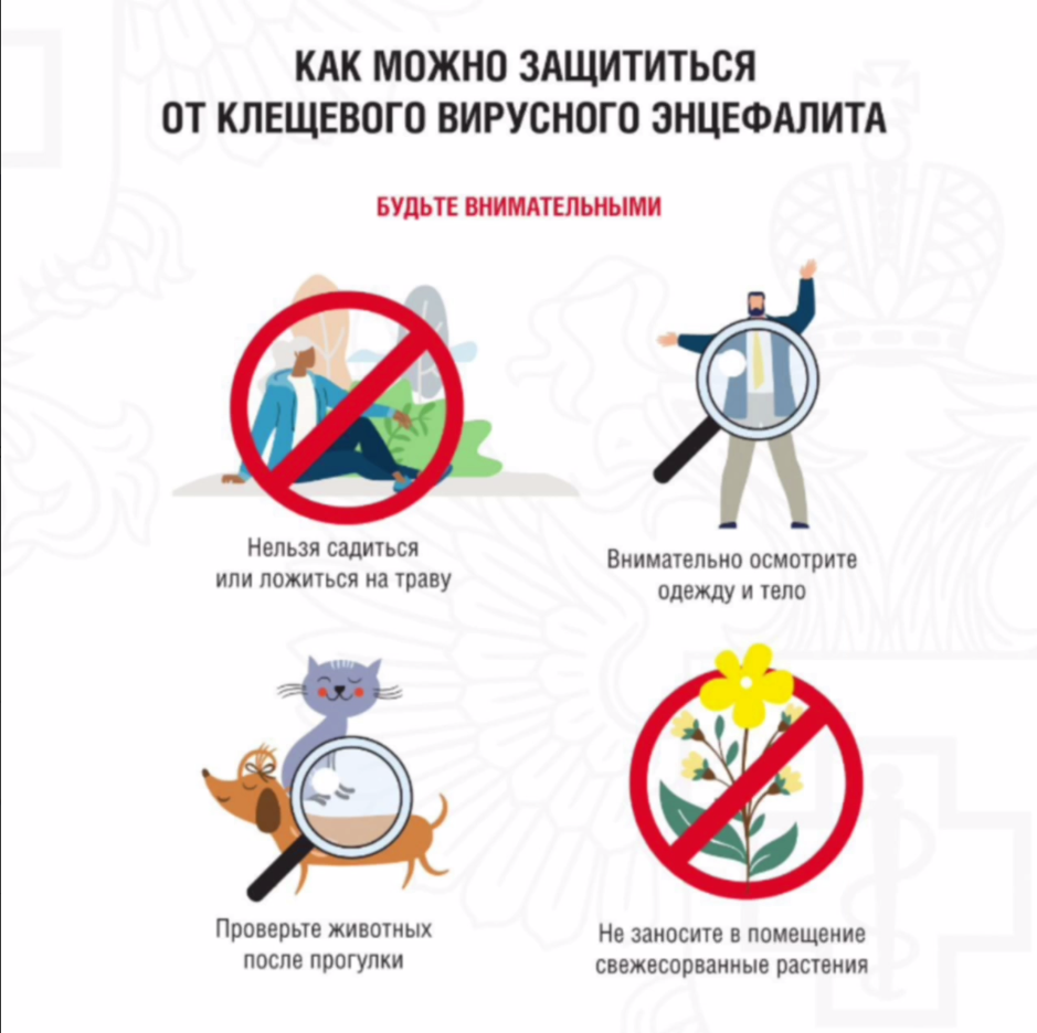Носить защитную одежду; Проводить само- и взаимоосмотры; Не сидеть на траве без подстилки; Осматривать домашних животных, которых берете с собой.Если вас укусил клещ, обязательно, обратитесь за медицинской помощью.