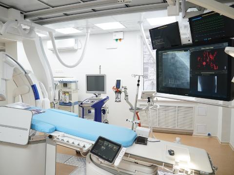 Новый комплекс больницы состоит из двух частей. В диагностической разместили аппараты магнитно-резонансной и компьютерной томографии с искусственным интеллектом и грузоподъемностью 200 килограммов. В лечебной части установили ангиограф. Аппаратура помогает выбрать оптимально подходящий для пациента маршрут операции. Потолочное крепление позволяет сделать контрольную компьютерную томографию прямо в процессе операции.