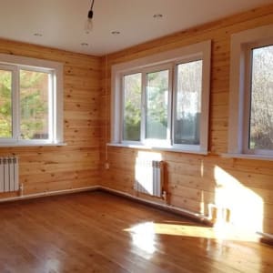 Бойлерное отопление, пластиковые стеклопакеты, натяжные потолки, на полу половая доска из сосны, красивая и удобная лестница из сосны.